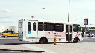 The airport operates a free shuttle bus between the two terminals. It has a stop on the middle island outside of the Shuttle Bus exit in the Baggage Claim area at Terminal 1 (their stop is at the front of the line) and near the Departures entrance at Terminal 2. It comes around every 15 minutes. I have seen two different size buses and a van used. Just look for a bus with the "McCarran Airport" logo or a white van with the "Clark County" logo. The rental car companies also run shuttle buses.