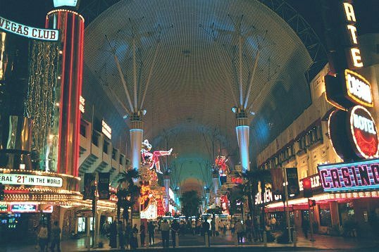 Map of Fremont Street (aka "Downtown") showing the locations of the resorts. The gray area represents the pedestrian mall, most of which is covered by the mesh canopy which serves as the display screen for the light show.